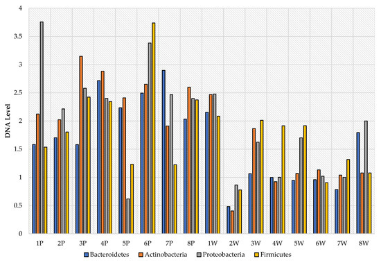 - De Gregoris, T.B.; Aldred, N.; Clare, A.S.; Burgess, J.G. Improvement of phylum-And class-specific primers for real-time PCR quantification of bacterial taxa. J. Microbiol. Methods 2011, 86, 351–356. [Google Scholar] [CrossRef]
