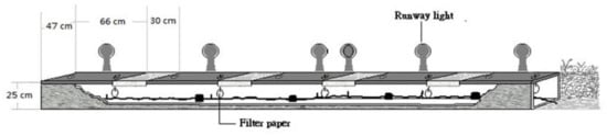 The navigation lights at Taoyuan International Airport, Taiwan are above underground wire culverts covered with five steel plates (Figure 2). Nine rows of culverts were selected, and the methods of corn/potato chips attraction and visual mound inspection were used to identify RIFA activity. In each Culvert, 3 uncapped tubes containing potato chips were placed for 2 h. In one row, approximately 200 live RIFAs were identified inside this culvert, but the other eight rows were clear. Then, filter papers were hung by using cotton thread from hand holes under each steel plate to adsorb odor in the nine culvert rows. There were 5 filter papers placed for RIFA scent adsorption in each culvert. After 24 h, the odor-adsorbed filter papers were collected, sealed in separate centrifuge tubes, and sent to the lab at 4 °C in less than 24 h. After incubation at 25 °C for 1 h, the samples were tested by four trained dogs (A, B, C, and E). This trial was practiced twice, and the PIR and false response rates were evaluated.