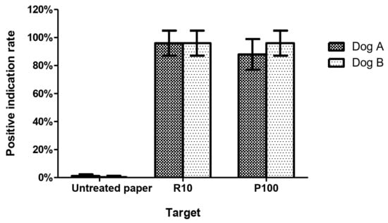 Several tools have been used as odor adsorbents and transmitters, and as training aids for canine detection training []. Recently, more canine training aids were studied, such as odor capture-and-release materials for explosive odorants and ovarian cancer cell lines for ovarian cancer detection [,]. The gypsy moth (Porthetria dispar L.) sex attractant pheromone disparlure has been applied to different objects for training, and dogs’ capacity to retrieve disparlure-treated sticks was higher than for treated rubber balls or tin cans []. Exudates from screwworm-infested wounds placed on balls and larvae-scented balls were used as target samples for dog training []. For termite detection, dogs were taught to associate terry cloth towels with termite scent []. A filter paper impregnated with bed bug scent using pentane extraction was 100% indicated by trained dogs and therefore useful for detector training []. Despite these reports, there was no scientific evidence validating the utility of filter paper odor adsorption. The present study is the first to show that it is a competent odor transporting medium.