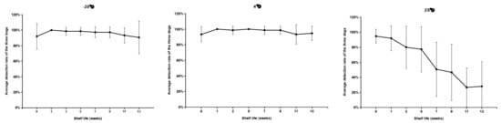 Three dogs sniffed scented filter papers stored at 24 different temperatures and durations. The samples stored at −20 °C and 4 °C were detectable throughout the 13-week storage period with a >90% PIR. Conversely, the 90% positive detection rate for samples stored at 25 °C was only achieved in the first week; the detection rate decreased with longer storage (Figure 4). The mean positive detected rates of the samples stored at three different temperatures were not significantly different between samples tested on the date of collection and those stored for 1 week (p = 0.92). After the samples were stored for 3, 5, 7, 9, 11, for 13 weeks, the mean positive detection rate of the 25 °C samples was lower than the rates of those stored at −20 °C and 4 °C (p < 0.05). Moreover, the detection rate of the 25 °C samples significantly decreased with longer storage (p < 0.0001), but no differences were found between those stored at −20 °C (p = 0.21) and 4 °C (p = 0.40) (Figure 5).