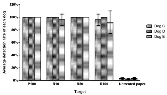 The RIFA detection rates of three dogs trained with odor-adsorbed filter paper. Columns represent the mean and standard deviation of 5 replicates of the tests performed by each detection dog. There were no differences in the positive detection rates in discriminating paper scented with 100 live RIFAs (P100) and 10, 50, and 100 live RIFAs (R10, R50, and R100) (p = 0.28, Kruskal–Wallis test). The average false response rate was 3.0%.