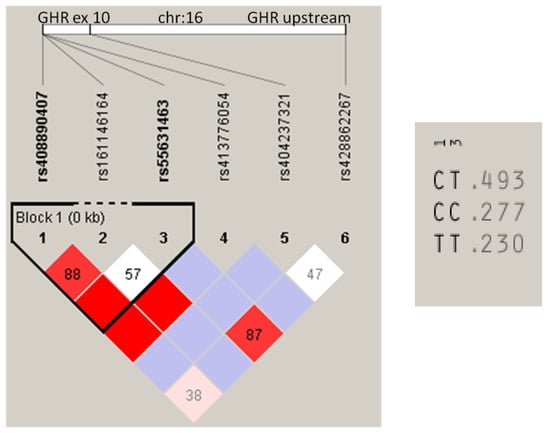 - Barrett, J.C.; Fry, B.; Maller, J.; Daly, M.J. Haploview: Analysis and visualization of LD and haplotype maps. Bioinformatics 2005, 21, 263–265. [Google Scholar] [CrossRef]