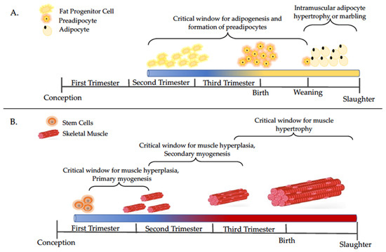 Maternal nutrient status during gestation is critical for fetal skeletal muscle and intramuscular adipocyte development, which can be a determinant factor of the future performance and carcass characteristics of the progeny [13,14,15]. The impacts of maternal diet on offspring growth and performance are variable and dependent on the timing of the dietary intervention, as muscle and adipose development occur at specific times in gestation (see Figure 1A,B). During the prenatal stage, the formation of muscle fibers can be altered by maternal nutrient restriction, leading to a reduction in the total number of secondary muscle fibers, which permanently reduces animal performance [13]. Conversely, maternal overnutrition promotes the preeminent expression of adipogenic genes in fetal skeletal muscle [16], which likely program a greater number and size of adipocytes of progeny skeletal muscle postnatally [15]. Therefore, maternal nutritional status during fetal development is a major factor affecting the lifetime productivity of the offspring [2,4,5].