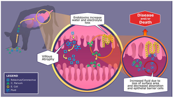 Diarrhea is a result of decreased absorption and increased secretions of water and electrolytes in the gut. This process generally begins with the ingestion of a single or multiple pathogens, which initiates numerous pathogenic physiological pathways leading to severe dehydration [33,38,39]. Consequently, the loss of fluids can cause a multitude of health and behavioral issues, including aversion to suckling, anorexia, depression, weakness and, in severe cases, death [7,33,38].