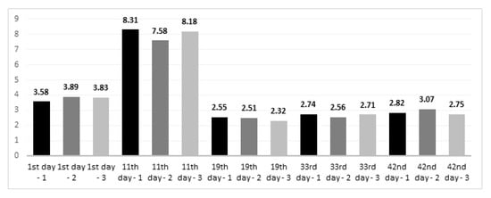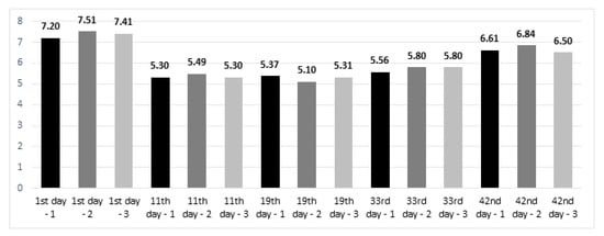 pH of the litter. Notes: 1—control group; 2—group with halloysite in the litter; 3—group with zeolite in the litter; 1st day—stater feed period; 11th day—grower 1 feed period; 19th day—grower 2 feed period; 33rd day—finisher feed period; 42nd day—slaughter day; sampling was performed once on the mentioned days. No significant differences between groups were found (p > 0.05); mean values from various days were significantly different, with p-value < 0.05.