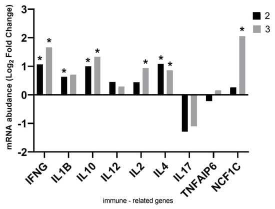 The relative expression of the intestinal immune response genes analyzed in the cecal mucosa showed statistically significant upregulation of IFNG (p = 0.03 for group 2; p = 0.0005 for group 3) and IL10 (p = 0.006 for group 2; p = 0.005 for group 3). The addition of zeolite (group 3) significantly increased the expression of IL2 (p = 0.01) and NCF1C (p = 0.003) genes, and the addition of halloysite (group 2) also increased expression of IL1β (p = 0.05). The administration of both substances to litter had a numerical (p > 0.05) effect on the reduction of IL17 expression. The relative expression levels of immune-related genes are presented in Figure 3.