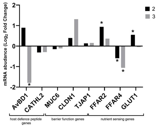 Our research involved the analysis of three genes related to nutrient sensing: free fatty acid receptors (FFARs) and glucose transporter (GLUT). Proteins encoded by FFAR2 and FFAR4 genes, whose significant regulation has been demonstrated in this experiment, regulate lipids and glucose metabolism. Loss of function of FFARs, due to the fact that they regulate lipid metabolism, increases the risk of excessive fat gain []. Our research shows that the administration of minerals in the feed and, additionally, halloysite in the litter significantly increases FFAR2 expression. FFAR2 is activated by SCFA, which play a significant role in regulating the organisms’ energy homeostasis and intestinal immunity. SCFAs are produced by the intestinal microbiota. They are a kind of communicator between the microbiota and the immune system (they are responsible for maintaining balance in anti-inflammatory and pro-inflammatory reactions) []. Our research suggests altered activity of the intestinal microbiota after the addition of the minerals, but this aspect requires further specific analysis. The proteins encoded by the FFAR4 genes mediate the release of incretin hormones from the epithelium into the lumen of the gut. These include GLP-1 and GIP, which are intestinal hormones that are released upon the response to food intake that inhibit gastric emptying and reduce appetite and food intake []. The mechanism is designed to stimulate satiety and reduce further feed intake []. The negative regulation of the FFAR4 gene in the intestinal mucosa may be associated with the inhibition of the activity of incretin hormones and thus may be associated with the increase in body weight of the birds in the group where the minerals were added to the feed and litter. GLUTs are involved in the absorption of glucose through the epithelial cell membrane. Glucose uptake is important due to the fact that it acts as a fuel and an important metabolic substrate in the organism. Group 2 showed a significant increase in GLUT1 expression, which seems to be beneficial in terms of its function. GLUT1 facilitates basal glucose uptake, which is necessary for growth and development in most cells [].