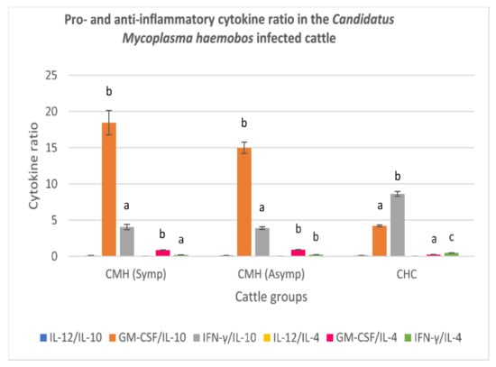 Pro- and anti-inflammatory cytokine ratio in symptomatic and asymptomatic cattle naturally infected with Candidatus Mycoplasma haemobos. Molecular detection and confirmation of the blood parasite was by PCR amplification of 16S rRNA gene. Candidatus Mycoplasma haemobos infected symptomatic cattle had the highest serum GM-CSF:IL-10 cytokine ratio. Low IL-12:IL-10, IL-12:IL-4, IFN-γ:IL4 ratios were significant findings in both symptomatic and asymptomatic C. M. haemobos infected cattle. CMH (Symp): Symptomatic Candidatus Mycoplasma haemobos infected cattle; CMH (Asymp): Asymptomatic Candidatus Mycoplasma haemobos infected cattle; CHC: Clinically healthy cattle (control). IL-12: Interleukin 12; IL-10: Interleukin 10; GM-CSF: Granulocyte Macrophage-colony stimulating factor; IFN-γ: Interferon gamma; IL-4: Interleukin 4. (a–c) Different superscripts refer to significant differences in the parameters between C. M. haemobos infected cattle and clinically healthy cattle (p < 0.05).