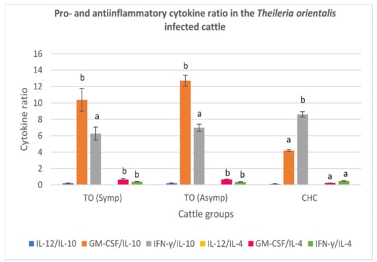 Pro- and anti-inflammatory cytokine ratio in symptomatic and asymptomatic cattle infected by Theileria orientlalis. Molecular detection and confirmation of T. orientalis was by PCR amplification of the MPSP gene. High serum GM-CSF:IL-10 and GM-CSF:IL-4, and low IL-12:IL-10 levels were observed in both symptomatic and asymptomatic cattle infected with Theileria orientalis. Also, low IL-12:IL-4 and IFN-γ:IL-10 levels were found in both symptomatic and asymptomatic T. orientalis infected cattle. TO (Symp): Symptomatic Theileria orientalis infected cattle. TO (Asymp): Asymptomatic Theileria orientalis infected cattle. CHC: Clinically healthy cattle (control). IL-12: Interleukin 12; IL-10: Interleukin 10; GM-CSF: Granulocyte Macrophage-colony stimulating factor; IFN-γ: Interferon gamma; IL-4: Interleukin 4. (a,b) Different superscripts refer to significant differences in the parameters between T. orientalis infected cattle and clinically healthy cattle (p < 0.05).