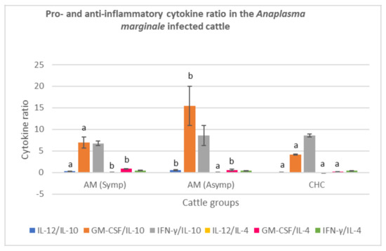 Pro- and anti-inflammatory cytokine ratio in symptomatic and asymptomatic cattle infected with A. marginale. Molecular detection and confirmation of A. marginale was by PCR amplification of the MSP4 gene. High serum GM-CSF:IL-4 level was observed in both symptomatic and asymptomatic A. marginale infected cattle. AM (Symp): Symptomatic Anaplasma marginale infected cattle, AM (Asymp): Asymptomatic Anaplasma marginale infected cattle. CHC: Clinically healthy cattle (control): IL-12: Interleukin 12; IL-10: Interleukin 10; GM-CSF: Granulocyte Macrophage-colony stimulating factor; IFN-γ: Interferon gamma; IL-4: Interleukin 4. (a,b) Different superscripts refer to significant differences in the parameters between A. marginale infected cattle and clinically healthy cattle (p < 0.05).