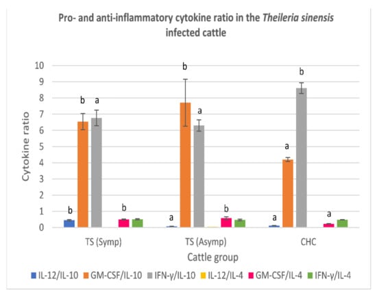 Pro- and anti-inflammatory cytokine ratio in symptomatic and asymptomatic cattle infected with Theileria sinensis. Molecular detection and confirmation of blood pathogens were by PCR ampli-fication of MPSP gene. High serum GM-CSF: IL-10 and GM-CSF:IL-4 ratios were observed in both symptomatic and asymptomatic Theileria sinensis infected cattle, respectively. TS (Symp): Symp-tomatic Theileria sinensis infected cattle. TS (Asymp): Asymptomatic Theileria sinensis infected cattle. CHC: Clinically healthy cattle. (control). IL-12: Interleukin 12; IL-10: Interleukin 10; GM-CSF: Granulocyte Macrophage-colony stimulating factor; IFN-γ: Interferon gamma; IL-4: Interleukin 4. (a,b) Different superscripts refer to significant differences in the parameters between T. sinensis infected cattle and clinically healthy cattle (p < 0.05).