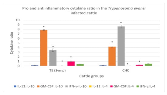 Pro- and anti-inflammatory cytokine ratio in symptomatic cattle naturally infected with Table 1. 2 VSG gene. High serum GM-CSF:IL-10 and GM-CSF:IL-10 ratios, and low IL-12:IL-10 and IFN-γ:IL-10 ratio were prominent findings in the Trypanosoma evansi infected cattle. CHC: Clinically healthy cattle (control). IL-12: Interleukin 12; IL-10: Interleukin 10; GM-CSF: Granulocyte Macrophage-colony stimulating factor; IFN-γ: Interferon gamma; IL-4: Interleukin 4. * Asterisk superscript on a parameter indicates significant difference p < 0.05.