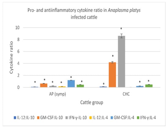 In the symptomatic cattle infected with A. platys, a low IL-12:IL-10, GM-CSF:IL-10 and IFN-γ:IL-10, relative to clinically healthy cattle, were recorded. A high IL-12:IL-4 ratio was also recorded in the A. platys-infected cattle showing clinical signs of the disease. Likewise, a high serum GM-CSF:IL-4 ratio was found in symptomatic A. platys-infected cattle, and the IFN-γ:IL-4 value obtained from serum of symptomatic A. platys-infected cattle which did not differ significantly from that of clinically healthy cattle were also recorded (p > 0.05) (Figure 6).
