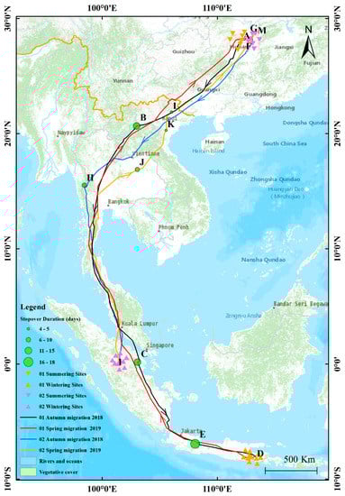 From March 2019 (Table 2), the two Chinese Sparrowhawks embarked on their spring migration, with Bird 01 and 02 using one and three stop-over sites, respectively. Bird 01 spent 18 days in Malang, Indonesia, while Bird 02 stopped at one stop-over site in Thailand and two stop-over sites in Vietnam, for 10, 4, and 5 days, respectively. The birds eventually arrived in Changsha, Hunan Province, China, where they stayed for the summer of 2019. Birds 01 and 02 stayed for 110 and 124 days, respectively. From the research, we can see that the Chinese Sparrowhawks summered and wintered for more than 3 and 4 months, respectively.