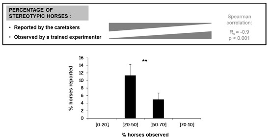 Discrepancy between observed (i.e., direct observation by trained experimenter) and reported (i.e., questionnaires to caretakers) prevalence of stereotypic horses per facility (N = 26 riding schools, 360 horses). Note that there is no report of stereotypic horses in the facilities where most or all horses were observed performing stereotypic behaviors (Spearman correlation). **: Kruskal Wallis test, p = 0.02, Adapted from Lesimple et Hausberger [129].