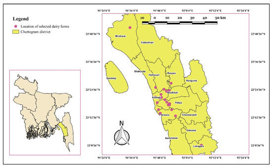 The Chattogram district of Bangladesh is located in the south-eastern part of the country at 22°0′45″ N and 92°6′1″ E. This district is subdivided into 18 administrative areas called upazillas or thanas. A comprehensive list of 102 dairy farms, each consisting of at least 2 lactating cows, within the Chattogram district was created by the Udder Health Bangladesh (UHB) team at Chattogram Veterinary and Animal Sciences University (CVASU) with the support of the upazilla livestock office and veterinary hospital. Initially, 2–3 villages or wards per upazilla or thana were chosen based on the highest cattle population density in the Chattogram district [36]. From there, a cohort of 24 farms (Figure 1) (representing 9 upazillas or thanas, each contributing between 1 and 9 farms) consisting of 1383 lactating cows were selected based on the willingness of the farmer to participate in a 6-month prospective cohort study (May to October 2018). The selected 24 dairy farms in this study were commercial farms, which we defined as farms rearing ≥9 cross-breed cows, adopting stall-feeding, which sell most of their milk. Commercial farms were chosen as this is the farm type we expect to become most important in the future. The study was approved and performed in line with the guidelines of the animal experimentation ethics committee (AEEC) of CVASU and written consent was taken from each farmer to participate in the study.