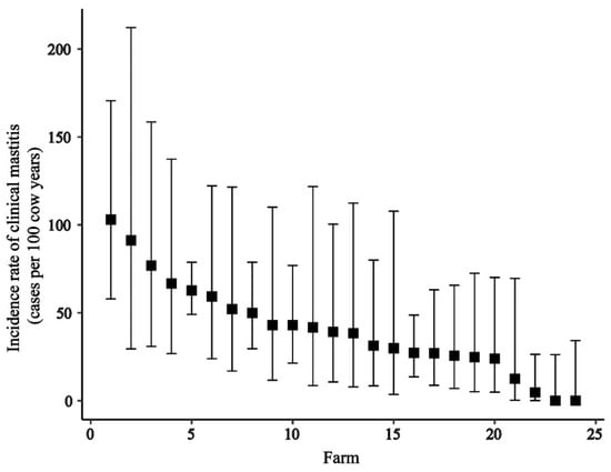 Farm-level incidence rate of clinical mastitis (cases per 100 cow-years) on 24 dairy farms in the Chattogram region in Bangladesh. The black box indicates the calculated cow-level incidence rate of clinical mastitis of each of the farms. The upper and lower limits indicate the 95% CI of the incidence rate.