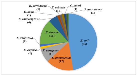 Out of the 1050 animals, there were 69 disease cases, with a sampling fraction of 6.6% (95% CI 5.2–8.3%). Seventy-six Gram-negative bacteria were recovered from 59 disease cases with a percentage of 85.5% (95% CI 75.3–92.8%). The identified isolates were: 36 Escherichia coli isolates (47.4%, 95% CI 36.54–58.45%), 20 Klebsiella spp. isolates (26.3%, 95% CI 16.9–37.7%), 18 Enterobacter spp. isolates (23.7%, 95% CI 14.7–24.8%), and a single Citrobacter koseri, and Serratia marcescens isolates (1.3%, 95% CI 0.2–7.1% each) (Figure 1). Klebsiella spp. include 12 K. pneumoniae isolates, six K. aerogenes isolates, a single isolate of K. oxytoca, and a single isolate K. varciicola. Enterobacter spp. include 11 E. cloacae isolates, four E. cancerogenus isolates, a single isolate of either E. kobei, E. hormaechei or E. asburia.