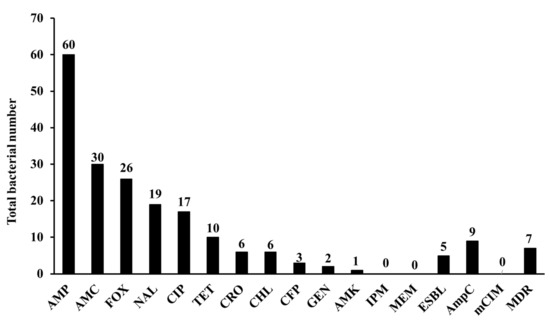 In this study, 9.2% (95% CI 4.5–17.8%) of the isolates showed multidrug-resistant profiles attributed to the resistance to three or more antimicrobial classes (Figure 2, Supplementary Table S1). The isolates showed high resistance rates to AMP, AMC, FOX, NAL, and CIP, 78.9% (95% CI 68.5–86.6%), 39.5% (95% CI 29.2–50.7%), 34.2% (95% CI 24.5–45.4%), 25% (95% CI 16.6–35.8%), and 22.4% (95% CI 14.5–33%), respectively. On the other hand, the isolates showed low resistance rates to TET (13.2%, 95% CI 7.3–22.6%), CRO (7.9%, 95% CI 3.7–16.2%), CHL (7.9%, 95% CI 3.7–16.2%), CFP (3.9%, 95% CI 1.4–11%), GEN (2.6%, 95% CI 0.7–9.1%), and AMK (1.3%, 95% CI 0.2–7.1%). All the isolates were sensitive to IPM and MEM (Figure 2, Supplementary Table S1).