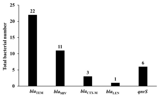 - Ejaz, H.; Younas, S.; Abosalif, K.O.; Junaid, K.; Alzahrani, B.; Alsrhani, A.; Abdalla, A.E.; Ullah, M.I.; Qamar, M.U.; Hamam, S.S. Molecular analysis of blaSHV, blaTEM, and blaCTX-M in extended-spectrum β-lactamase producing Enterobacteriaceae recovered from fecal specimens of animals. PLoS ONE 2021, 16, e0245126. [Google Scholar] [CrossRef] [PubMed]