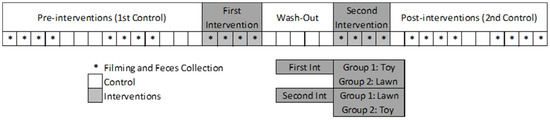 FCM levels were lower during the second period of interventions, but not associated with one specific type of intervention. Lefebvre et al. [8] found a reduction of cortisol levels in working dogs in response to the establishment of regular dog-handler interactions. Therefore, this result could be due to the increase of human contact with the animals throughout the experiment (put on the leash to walk the animal to the lawn area or enter the kennel to hang the toy and take it off). A non-mutually excluding explanation would be that the combination of both interventions was necessary to result in reduced cortisol levels. Additionally, new stimuli can have a “challenge” effect on dogs [9,25]. Therefore, the routine alteration due to the start of the experiment could have challenged the coping mechanism of the subjects, hampering the effects of the first period of intervention on FCM levels. In addition, it is important to consider that the lower levels of FCM seen only in the second period could also indicate that animals were less aroused by the interventions throughout time.
