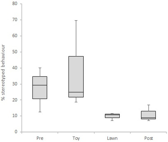 Boxplot of percentage of stereotyped behaviour in our four experimental treatments (Pre: pre-interventions; Toy: toy intervention; Lawn: lawn intervention; Post: post-interventions). Analysis of only high-stereotyping individuals.