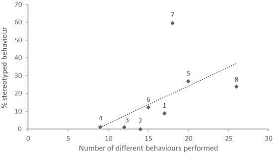 The number of different behaviours performed by each animal was positively correlated (Spearman, ρ = 0.786; p < 0.05) with the percentage of stereotyped behaviours (Figure 4), and negatively correlated (Spearman, ρ = −0.810; p < 0.05) with the percentage of rest/relaxation behaviours performed by the same subject.