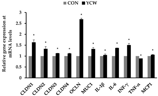 Relative gene expression levels of tight junction proteins and inflammatory cytokines in the ileal tissue of weaned pigs. n = 7. CON = a basal diet; YCW = CON with 0.05% dietary yeast cell wall; CLDN1 = claudin-1; CLDN2 = claudin-2; CLDN3 = claudin-3; CLDN4 = claudin-4; OCLN = occludin; MUC1 = mucin 1; IL-1β = interleukin-1β; IL-6 = interleukin-6; INF-γ = interferon-γ; TNF-α = tumor necrosis factor-α; MCP1 = monocyte chemoattractant protein 1. Data were analyzed by t-tests. * Different between CON and YCW (p < 0.05).
