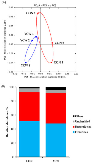 Principal coordinate analysis (PCoA) plot for weighted UniFrac distances in gut microbial communities from piglets’ feces of each dietary treatment (A). Taxonomic composition shows relative abundance of fecal microbiota in each treatment group at phylum level (B) and genus (C) level. n = 3. CON = a basal nursery diet (red, ○); YCW = CON with 0.05% dietary yeast cell wall (blue, □).