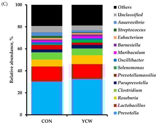The result of diversity in the fecal bacterial community is shown in Table 6. The total sequence numbers were 128,647 ± 759 reads in the CON group and 122,242 ± 44,506 reads in the YCW group. The differences in alpha diversity indexes obtained between dietary treatments were not significant in the Chao1, Shannon, and Simpson diversity indices. The PCoA plot of the weighted UniFrac distances, such as beta diversity, illustrates the composition of microbial communities between the CON and YCW groups (Figure 2A). The microbial communities visually formed the distinct separation between CON and YCW groups on day 35. A comparison of the relative abundance of taxonomic groups at the phylum and genus levels between CON and YCW are shown in Figure 2. The relative abundance of bacteria at the phylum level were not significantly different between CON and YCW pigs (Figure 2B). However, weaned pigs fed YCW increased (p < 0.05) relative abundance of Prevotella and Roseburia compared with those fed CON (Figure 2C) at the genus level.