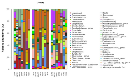 Coming to genera, a trend to reduction in the overall microbial diversity was still evident, along with a prevalence in the relative average abundance of members of the Enterobacteriaceae (35.94%). Genera such as Bifidobacterium (1.83%; p = 0.15), Bacteroides (11.21%; p = 0.27), Fusobacterium (3.44%; p = 0.33), Akkermansia (3.94%; p = 0.32) and Streptococcus (7.44%; p = 0.55) were all represented with a tendency to increase in average abundance.