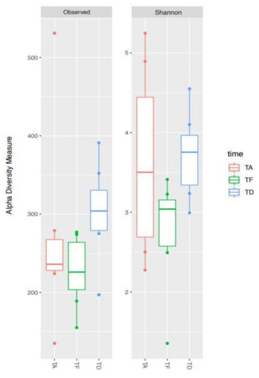 Alpha diversity changes of gut microbial ecosystem in seven hospitalized neonatal foals before and after broad-spectrum antimicrobial treatment. Boxplots of observed species and Shannon indices representing data at the timepoints Ta (TA), Te (TF) and Td (TD).