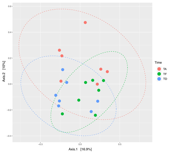 Beta diversity changes of gut microbial ecosystem in seven hospitalized neonatal foals before and after broad-spectrum antimicrobial treatment. PCoA analysis on unweighted UniFrac distances of fecal microbiota at the three timepoints. Different colors represent samples at three timepoints. A significant difference in clustering of samples at the three timepoints was found (PERMANOVA = 0.05). TA (Ta): before antimicrobial treatment, TF (Te): end of antimicrobial treatment, TD (Td): time of hospital discharge.