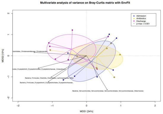 In Figure 4, the bacterial genera were superimposed on the PCoA plot based on the Bray–Curtis dissimilarity index of the compositional structures of samples at the three timepoints, and the bacterial genera most contributing to the ordination space were depicted. Fibrolytic microorganisms, such as Eubacterium, were more characteristic of Ta, but then it was lost after the treatment to reappear at discharge. The genus Akkermansia was more characteristic of Td than the earlier time points.