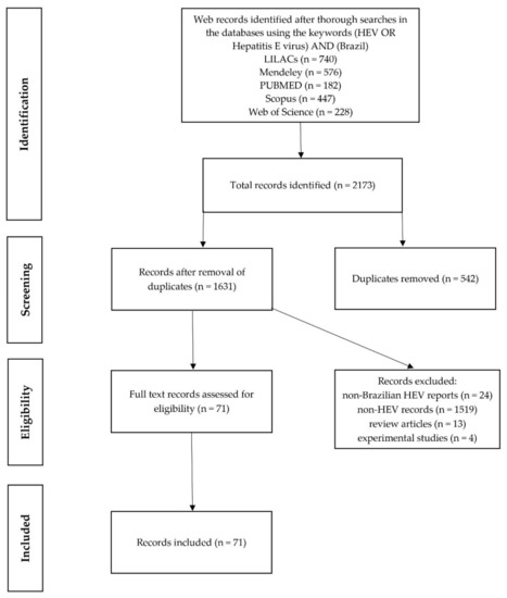 The literary search was made in the databases already mentioned above using the keywords (HEV OR Hepatitis E Virus) AND (Brazil). After reading the title and the abstract, papers that did not address Brazil as a scope or part of the scope, papers that did not study HEV, duplicate studies, review articles and experimental studies were excluded from this systematic review. Papers that did not make clear the information in the title and abstract were read in full and only those that contained the target content were included.