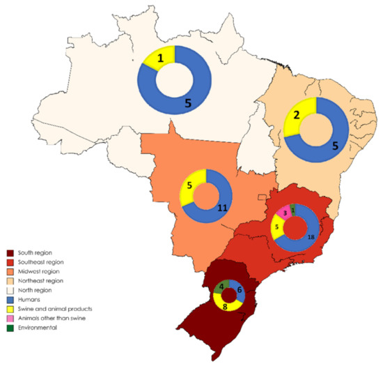 Distribution (number) of HEV studies according to the regions of Brazil and the origin (human, swine and animal products, animals other than swine, and environmental).