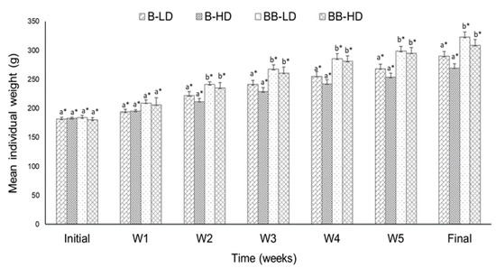 The final weight of BB hybrids was significant higher (p < 0.05) than B hybrids in both density groups (Figure 1). Better values of FCR and PER were observed for LD groups in both hybrids. WG and SGR showed no significant differences between LD and HD groups for BB backcrosses, and significant differences for B hybrids. However, BB backcrosses showed better results in both density groups when compared with B hybrids (Table 1).