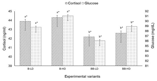 The cortisol level was slightly higher in crowded groups; however, no significant differences (p > 0.05) were found between densities for both hybrids. The level of cortisol in B hybrids was significantly higher than in BB hybrids (Figure 2).