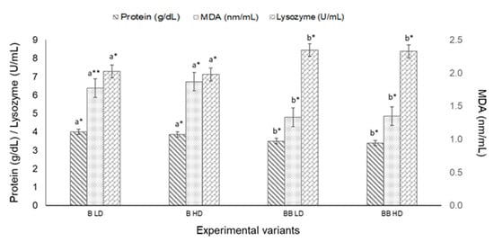 Serum protein, MDA, and lysozyme concentrations of bester (B) and bester × beluga (BB) sturgeon hybrids, cultured in different initial stocking densities LD (low density—2 kg/m2) and HD (high density—4 kg/m2). Data are presented as mean ± SEM (n = 3 tanks per treatment). Different letters indicate significant differences between hybrids from the same density group (p < 0.05, two-way ANOVA). Different symbols */** indicate significant differences between density groups of the same hybrid.