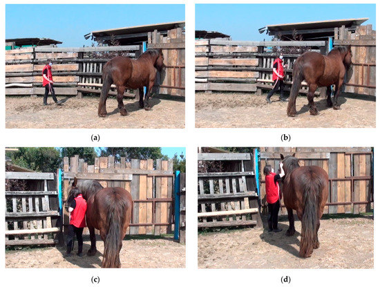 The Broken/Unbroken Test (BUT) consists of two phases: in the first phase (a–d, Approaching and Haltering), the tester entered the test area, walked towards the horse slowly with the halter in her hand, approached the horse, and then tried to halter it; in the second phase (e,f, Handling), which was only attempted if it had been possible to complete the first phase within 5 min, the tester tried to lead the horse three steps forwards and three steps backwards. In a real setting, the tester should wear protective equipment.