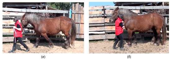 The BUT was a modified version of the tolerance test proposed by Wulf et al. [27]. Briefly, the tester entered the test area and walked towards the horse slowly with the halter in her hand, approaching and then trying to halter the horse (AHT; Figure 1a–d). The maximum time allowed for approaching and haltering the horse was 5 min. If it was not possible to approach and halter the horse within this time, the test ended. If it was possible to halter the horse within the maximum time, the tester started the second phase of the test (HT). During HT, the tester tried to lead the horse three steps forward (about 2 m distance) and three steps backwards (Figure 1e,f). When leading, the handler kept the horse relatively close to her right-hand side. The tester used a negative reinforcement procedure, applying light pressure on the lead rope and releasing the pressure as soon as the horse showed the desired behaviour (e.g., a step forward). The maximum time allowed for HT was 5 min. Thus, the maximum total time for BUT was 10 min. However, the procedure was stopped at the first sign of pain or if the horse showed a high level of distress (shaking movements of the head and tail, rearing, or moving away vigorously) or signs of aggression (ears laid backwards, attempting to bite or kick). A collaborator with experience in horse behaviour and handling used a stopwatch (Onstart 310, Kalenji, Decathlon, Villeneuve d’Ascq cedex, France) to record the time required for completion of each phase of the test and alerted the tester if the maximum time had elapsed or if the horse was displaying the aforementioned behaviour consistent with pain, distress, or aggression. All tests were filmed using a digital video camera recorder (HDR-CX115E, Sony, China) for later analysis. To evaluate test–retest reliability, the BUT was repeated 3 weeks later, by the same tester and under the same experimental conditions, on a subset of the original group of animals.