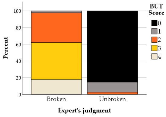 Relative distribution of the main observer’s BUT score according to the expert’s judgment of broken vs. unbroken status.