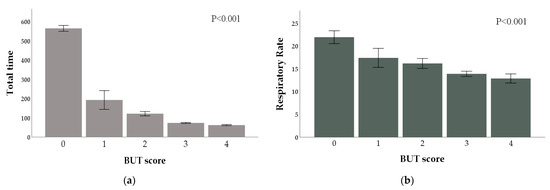 Means and standard errors of Total time (sec) (a) and Respiratory rate (bpm) (b) by BUT score. Ordinal logistic regression showed that, as Total time and Respiratory rate decrease, the probability of a higher BUT score increases (p < 0.001).