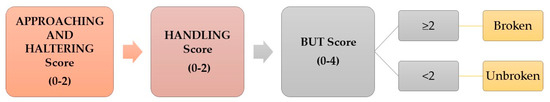 Proposed procedure to determine whether a horse is broken or unbroken. The horse’s behaviour during the Approaching and Haltering and Handling Tests should be scored on a 0–2 scale. The two scores are then summed to obtain the BUT score (range, 0–4). If the BUT score is ≥2, the horse should be identified as broken; if the BUT score is < 2, the horse should be identified as unbroken.