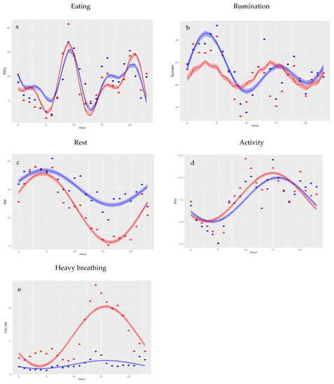 By adjusting the non-linear regression series to model the circadian rhythm of each of the behaviors, different equations were obtained. Table 3 shows these equations for each activity under both levels of THI. All behaviors were adjusted to periodic functions: rest behavior, added activity and heavy breathing were adjusted for periods of 24 h, while feeding and rumination behavior did not have a fixed period. This is because eating is influenced by the timing of the feeding of the animals.