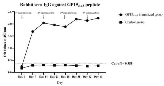 Antibody titer levels measured by indirect ELISA against GP194-43 peptide non-immunization (control group) and immunization in rabbits throughout the experimental period.