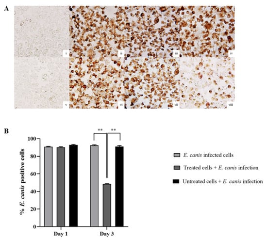 Notably, stimulated DH82 indicated different percentages of E. canis infected cells on the third day of the post-infection period (p < 0.01, Figure 2B). Furthermore, the treated group revealed lower percentages of positive staining cells with DAB staining (10–50% positive infected cells; score number 2. The percentages of E. canis infected cells in the positive control, treated and untreated groups were 92.291 ± 2.269, 48.573 ± 1.282, and 90.967 ± 3.132.
