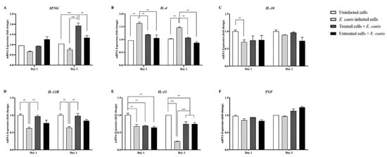 Gene expression levels in the E. canis-infected group revealed overall down-regulation among cytokine genes IFNG, IL10, IL12B, and IL13 (Figure 3). In contrast, IL4 displayed a degree of upregulation (p < 0.01) when in the E. canis-infected group compared with all groups throughout the post-infection phase of the experiment (Figure 3B).