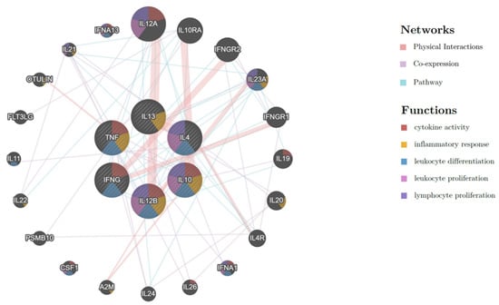 The data from all three experiments were combined and analyzed to identify any outliers using the robust regression and outlier removal (ROUT) method. The normality test was completed using the Shapiro-Wilk test prior to performing statistical analysis. Statistical analyses were performed using one-way ANOVA or multiple t-tests that employed GraphPad Prism 8.2.0 (GraphPad Software, Inc., San Diego, CA, USA). Results of the statistical analyses were considered significant in all experiments when p < 0.05. Multiple comparisons of each pair were made using the Holm–Sidak method. Results were reported as mean plus standard error (SE). The cytokine genes obtained from differential expression data were used to create a network of genes using CytoScape with a GeneMANIA plugin [].