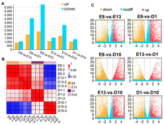 A total of 11,311 genes were identified as DEGs among the four stages (p < 0.05, FC > 2) (Table S2). The E8−D10 comparison group had the largest DEGs of 8242, including 5874 downregulated DEGs and 2368 upregulated DEGs. In contrast, the E8−E13 comparison group had the least number of DEGs of 1959, of which 1057 were downregulated, and 902 were upregulated (Figure 1A,C).